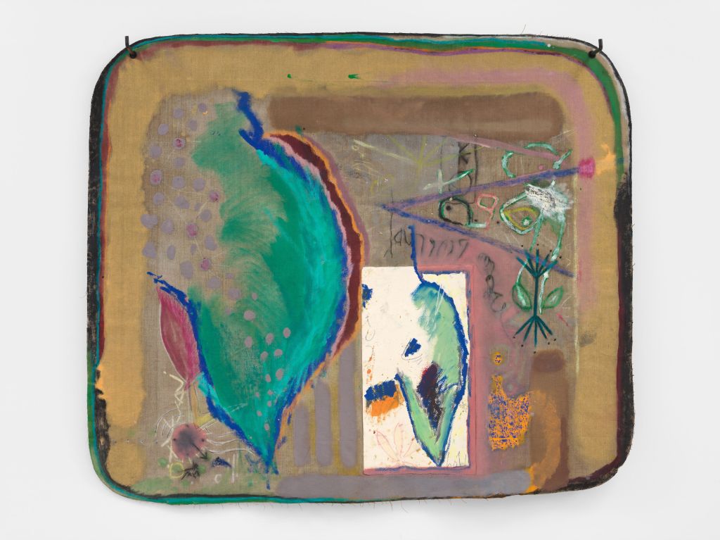MC: It is in the space in-between that your work creates a new language, almost. It’s a new language of representation which is not open but also not completely abstracted. I was thinking a lot about your work in the ‘In Rapture’ exhibition at the Bomb Factory, ‘Code to the Organic’. I love that work so much, and I remember you saying that it was about the origins of language. You had almost created your own alphabet system using these glyphs. There’s also little tiny pictures you’ve pasted to the canvas. All sorts of signs and significations which are, in a way, trying to decode the representation of something – maybe the act of representation itself.