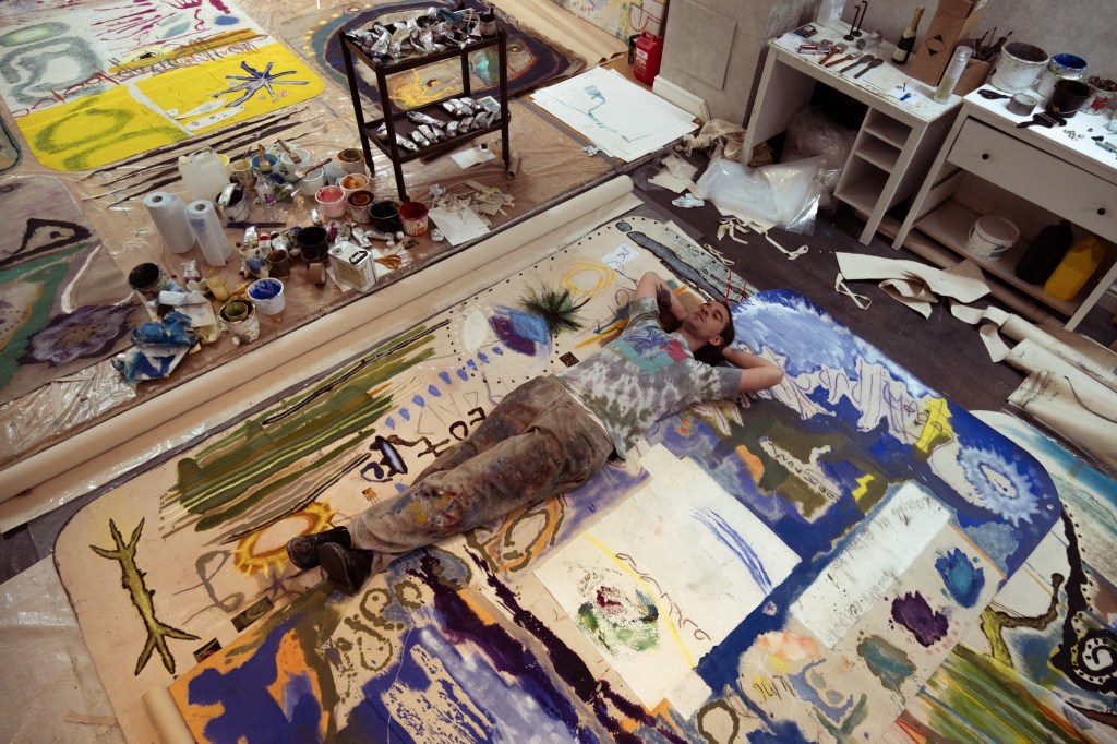 LW: Thank you. First and foremost, I felt restricted by just painting on a wall – the idea that the work is simply a layer of paint. You’re not considering the thing it’s made of. I then started to work on the floor, still stretched, but I couldn’t get to the middle of the canvas because you couldn’t step on it. So I took it off the stretcher, started painting on it. And it completely opened up a whole new way of working where I could cover all angles. I’m also painting on the floor – in so much of my practice I’m focused on natural forces and being in-balance. A real strong belief in animism, an animistic balance that exist in the world. So painting on the floor is utilising the organic force of gravity – when you drop paint it falls to the floor, it doesn’t fall to the wall. Being able to be on top of it, on it and in it, painting from the inside out, allows for so much more potential.