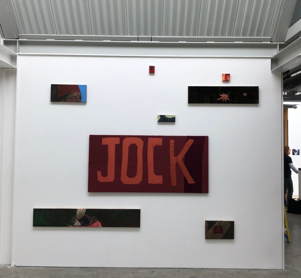 The centre of that work was a full textile piece with the word ‘JOCK. I have a painting of the exact same size of the ‘jock’ character, which is just a self-portrait. It’s kind of a headless figure. It was only a few days before the show that I sewed that piece. I wanted a varsity feel, but super fragmented. I’m always worries about how fabric and paint work together. I’ve had to really emphasise how distinct they are, because if I try to put them in the same language on the same plane, it just doesn’t look right.