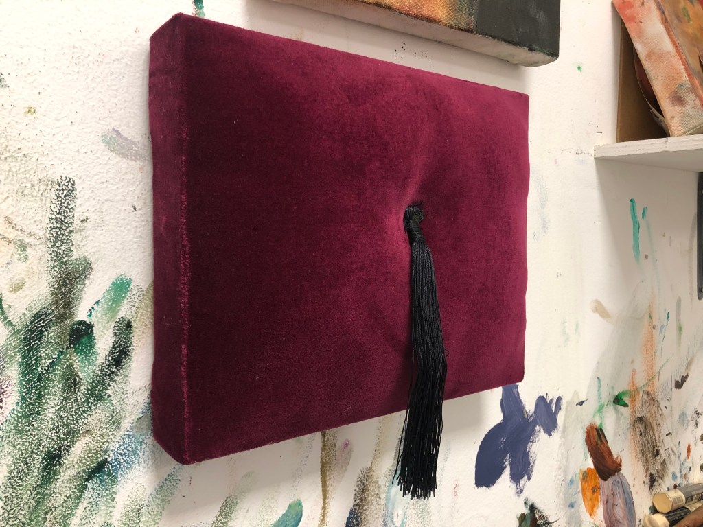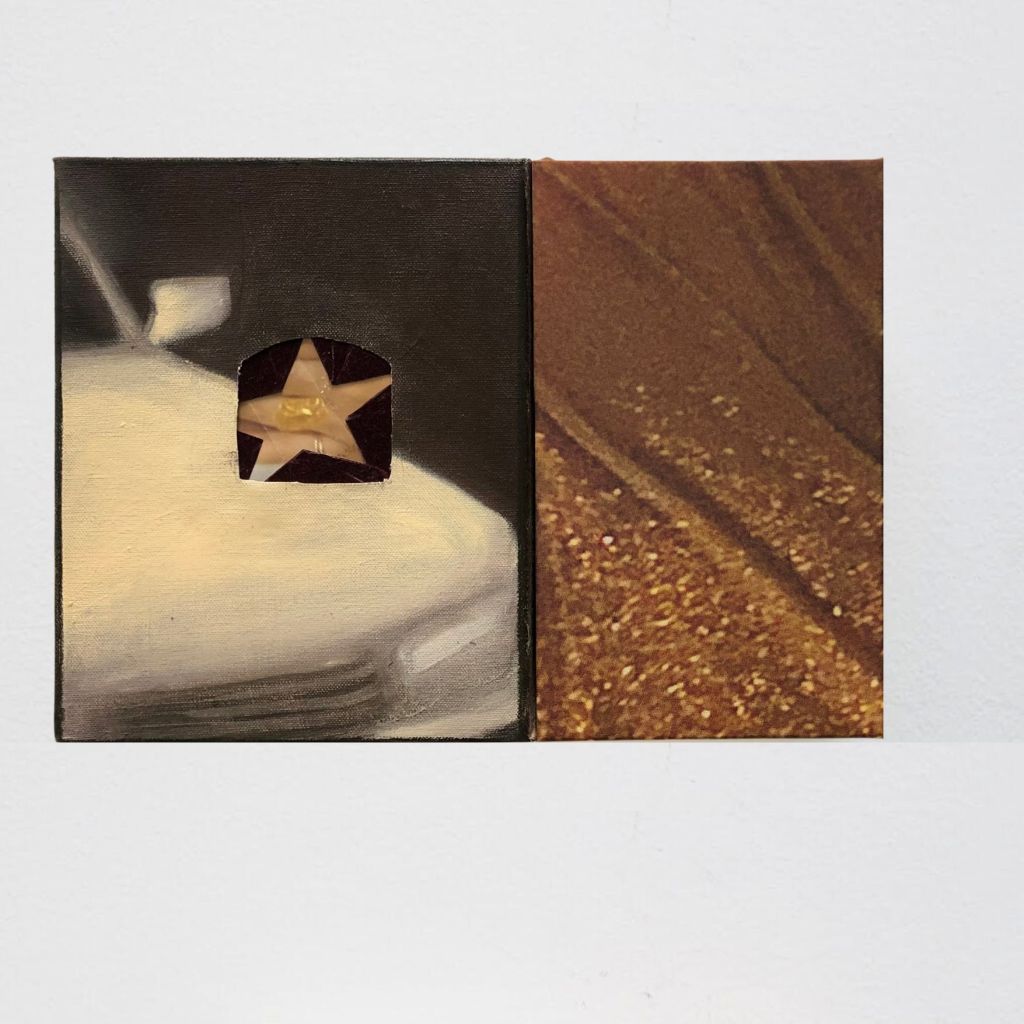 NR: And the star behind it – that velvet is from the same fez which is in that portrait in the degree show. It’s in the picture that I took that I then painted. I then took the fez apart. That one on the wall over there is the top bit. Inside the star I put the side of this bench near the capital building in Austin, Texas, where I sent a lot of time this year. I was just sitting on this bench. It’s kind of the perfect frame for this broken fez, and then behind that is my hand. So the work goes paper, velvet, and then painting.