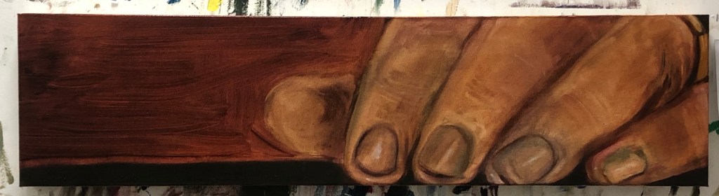 RN: They’re all from photographs I’ve taken. I’ll bring about ten or fifteen photographs into the studio every week, keeping everything around. I’ll go through them all like a book and pick an image that I resonate with at that moment, crop it, and then go from there. So this is a picture of my sister, and this is a distorted version of the Ugly Duchess’s hand at the National Gallery. Her hands are beautiful and so strange, it’s an insane painting. Obviously the reference comes from the painting, but it’s specifically about taking this crappy iPhone picture of this detail and then blowing it up. A lot of them are from pictures I’ve taken, but there’s also a lot of pictures from my grandmothers on both sides of the family. That one is of her car in the 70s.