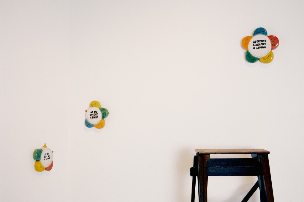 MC: And all the highlighter-shaped wall pieces have variations of the phrase ‘No-one owes Singapore a living’ written on them? What is the signification of changing the wording of that phrase?
