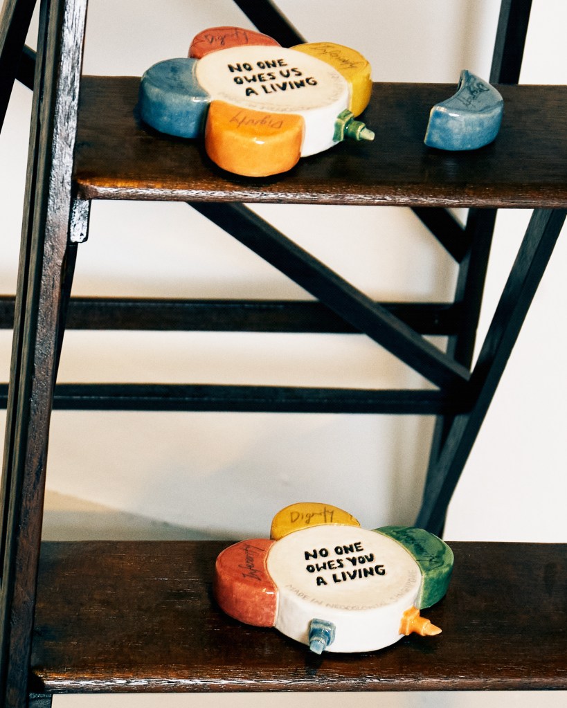 SP: All along I wanted to work on the message ‘No-one owes Singapore a living’. As I grew up, having this message shown to us at school, every year. The highlighter came about just a few months ago. The idea has been in my notes for a few years, but the form didn’t come to me until much later. Initially I wanted it to be a wall-work, just text with no form. But somehow this flower-shaped highlighter just popped up into my mind. It’s also another nostalgia thing for people born in the 90s. All my peers remember this flower highlighter given out by the school. The reason we brought in the actual flower highlighter into the exhibition was because my curator said to me that no-one would recognise this form. So I ordered a lot, and I put them on the floor. Because I have the fountain nearby, and I wanted to make it sort of like a natural garden. And the ladder is just from my own collection. I just loved the ladder and wanted to bring it here. And my curator asked me to bring it along as it would say something about social climbing. Then I decided to place some pieces of the highlighter works on the ladder. They were originally made to hang on the wall, six pieces in total, and the caps of the highlighters originally made to be placed on the floor, were then placed on the ladder as well.