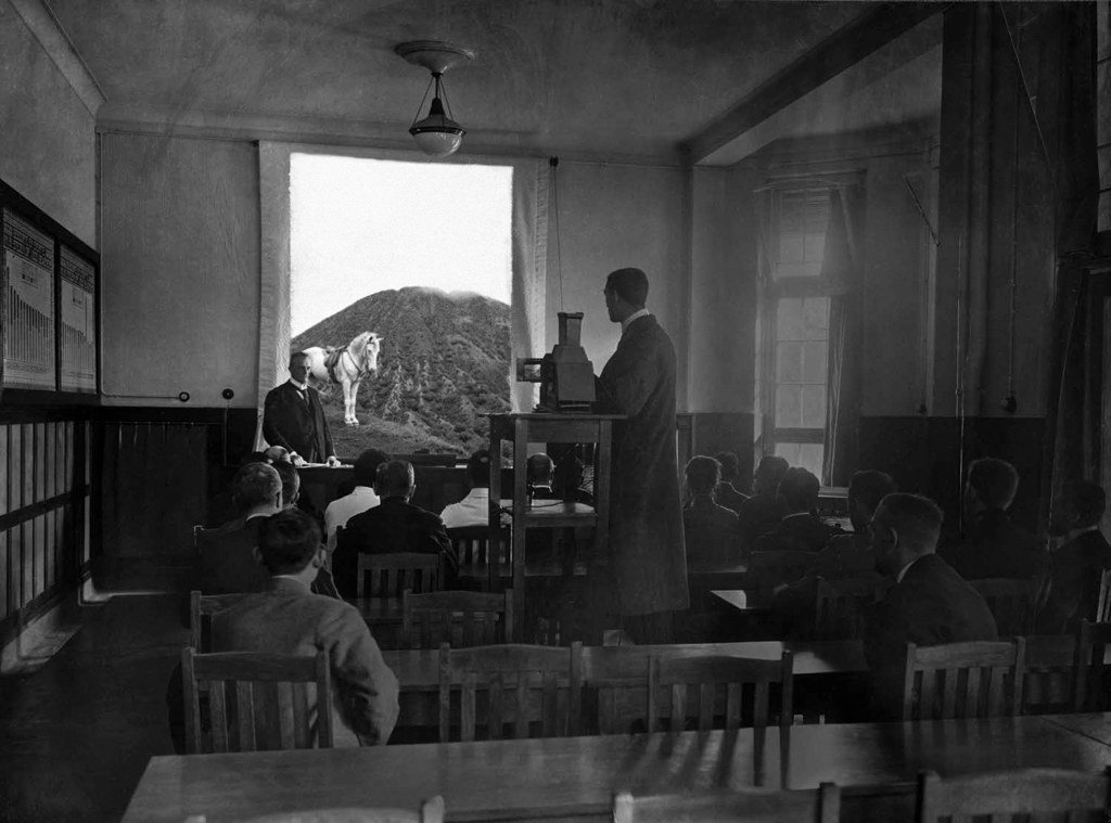 I cannot totally tell the process of this work, because it will lose its meaning. But I just kept photographing this horse, and at the same time I was going to other cities and other places. I montaged the horse into these different environments. For example, the one you mentioned in the airport in Bali: I actually wanted to document the US airplane that parked there during the G20 summit, behind the tunnel between the plane and the airport. You can see the plane in the background of the photo. After I got the horse image as an asset, I just put it in there. Also, I have a collection of colonial photographs, photos about Mount Bromo, and they had a horse on it. I added my horse in there too. I also had colonial photographs of a classroom lecture, and I put the horse as the image on the screen at the front of the class. A subject to analyse – why is this horse there?