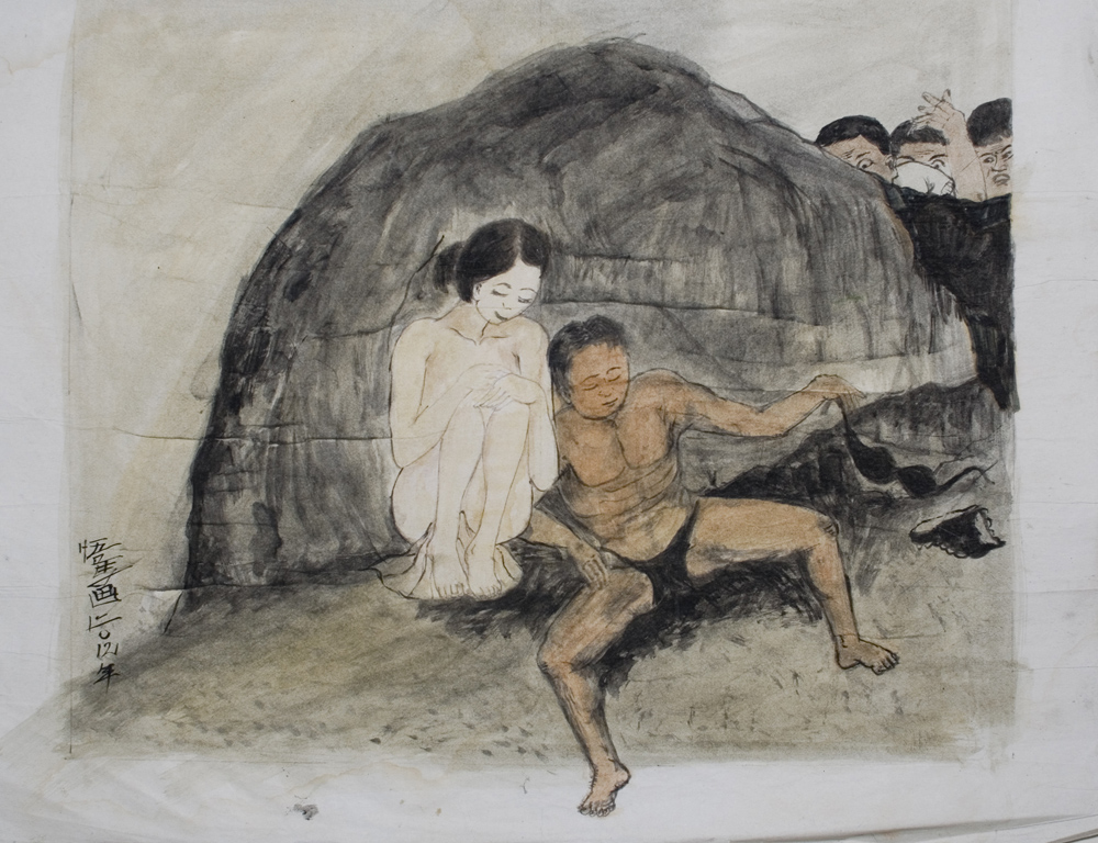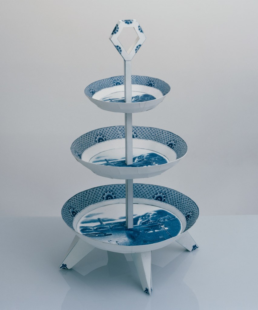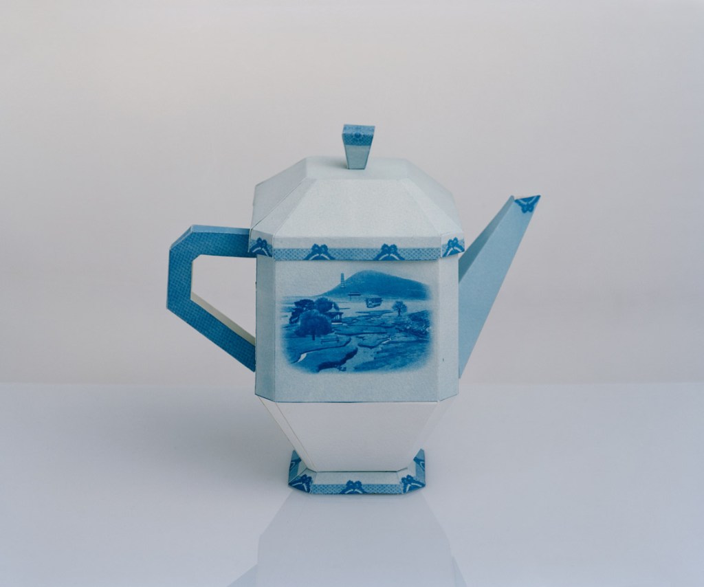 I made a willow pattern series when I was studying – willow pattern, the blue and white chinaware. I read this story about willow pattern. Back in the sixteenth or seventeenth century in Britain, importing chinaware from China started to get too expensive so they made their own. They had people writing these love stories for the willow pattern designs, like couples eloping. A very Western romantic story. In Chinese culture, you don’t elope and run away, you stay and suffer! Chinese love stories are all about suffering. Willow pattern became a kind of household subject, and in London I saw it everywhere, in every flea market. I was like, why does this look so Chinese and at the same time, so British? I was interested in exploring that idea. I started making cyanotype prints of all the oriental follies I could find in London – in Kew Gardens, Holland Park, they have all the pagodas and floating boats and whatever. So I painted this fake oriental landscape on cyanotype paper, and I folded them into objects that looked like chinaware – plates, cups, teapots, chamber pots, that sort of thing. That was my take on post-colonial art.
