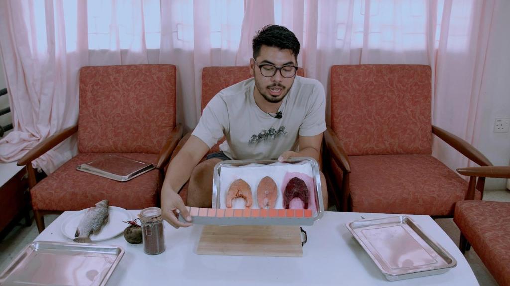 One of the reasons I made the installation and animation was a friend I met in Finland. She’s from Malaysia. She told me that she thought the salmon fillet was the fish. That’s how detached we are from salmon as an animal. And I thought, what’s wrong with her? Has she been locked up in a cellar? But it sort of epitomises the whole relationship we have with salmon, as Malaysians. We don’t see salmon in the fish tanks. Salmon is very foreign to us. So I thought, what if I make a fish that’s alive, but in fillet form? And it prompted me to make that work. I had the voice of Sir David Attenborough as the background, as the salmon fillets were swimming around in the fish tank.