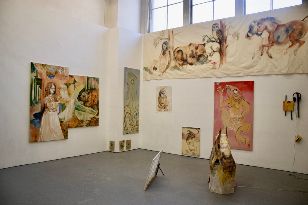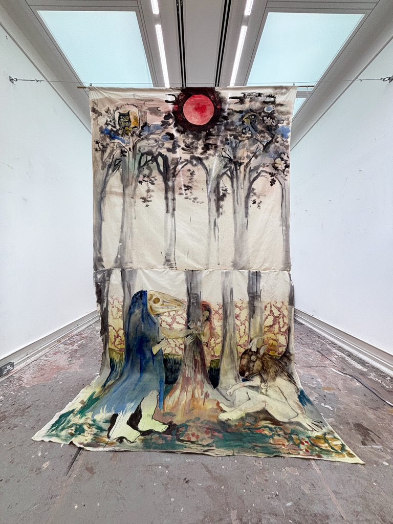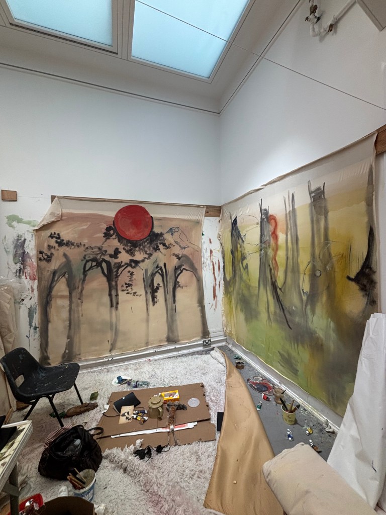 I want to say one of the tutors here as well. Just as a personality, I think Nadia Hebson, the head of painting here at Slade, is really important in the ways that she’s very open about financial issues, being a London artist, being stuck and not knowing what to make next, and having a portable studio as well, or not having the conventional studio space. The way that she talks about making work is really, really influential.