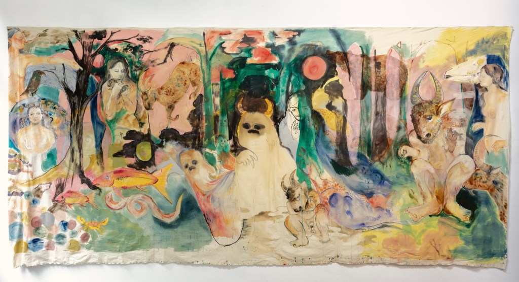 GH: Well this painting, I’m thinking about calling it ‘After Primavera’ – Primavera, the Botticelli painting in the forest, which I have above my bed. So the first thing I see when I wake up is that painting. It’s about springtime, but it’s also Troy picking the silver apple, and all sorts of other different references.